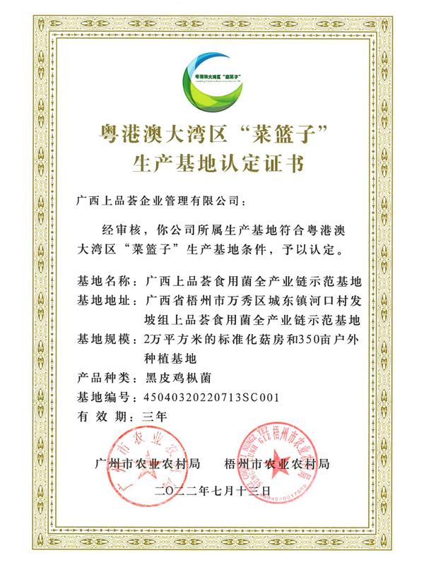 • 粵港澳區“菜籃子”生產基地認定證書